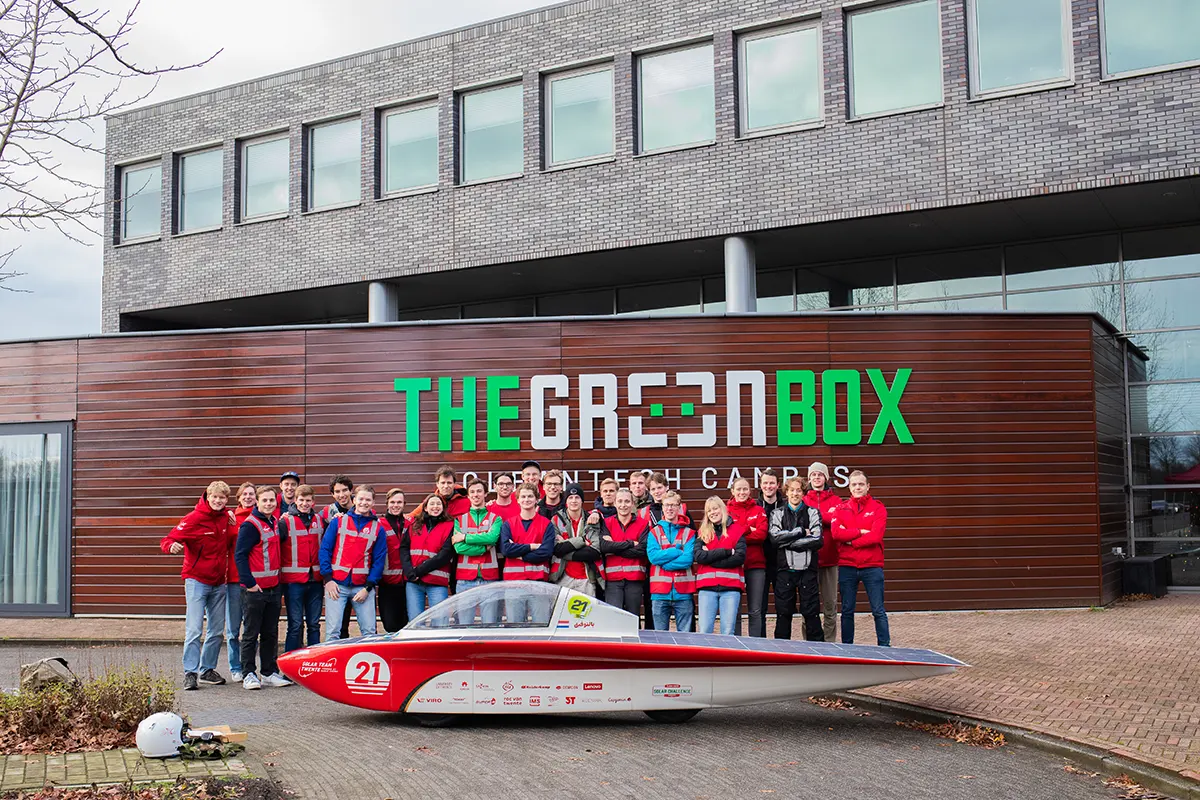 Op The Green Box Cleantech Campus ontvingen we het Solar Team Twente, bestaande uit meer dan 30 studenten van ROC van Twente, Hogeschool Saxion en de University of Twente. Ze transformeerden onze campus tot een testlocatie voor hun innovatieve zonneauto. Dankzij onze uitgebreide faciliteiten konden ze simulaties uitvoeren en cruciale tests doen, iets wat niet op de openbare weg mogelijk was. Het Solar Team Twente werkt jaarlijks aan baanbrekende technologieƫn, met als doel de meest efficiƫnte zonneauto ter wereld te bouwen.