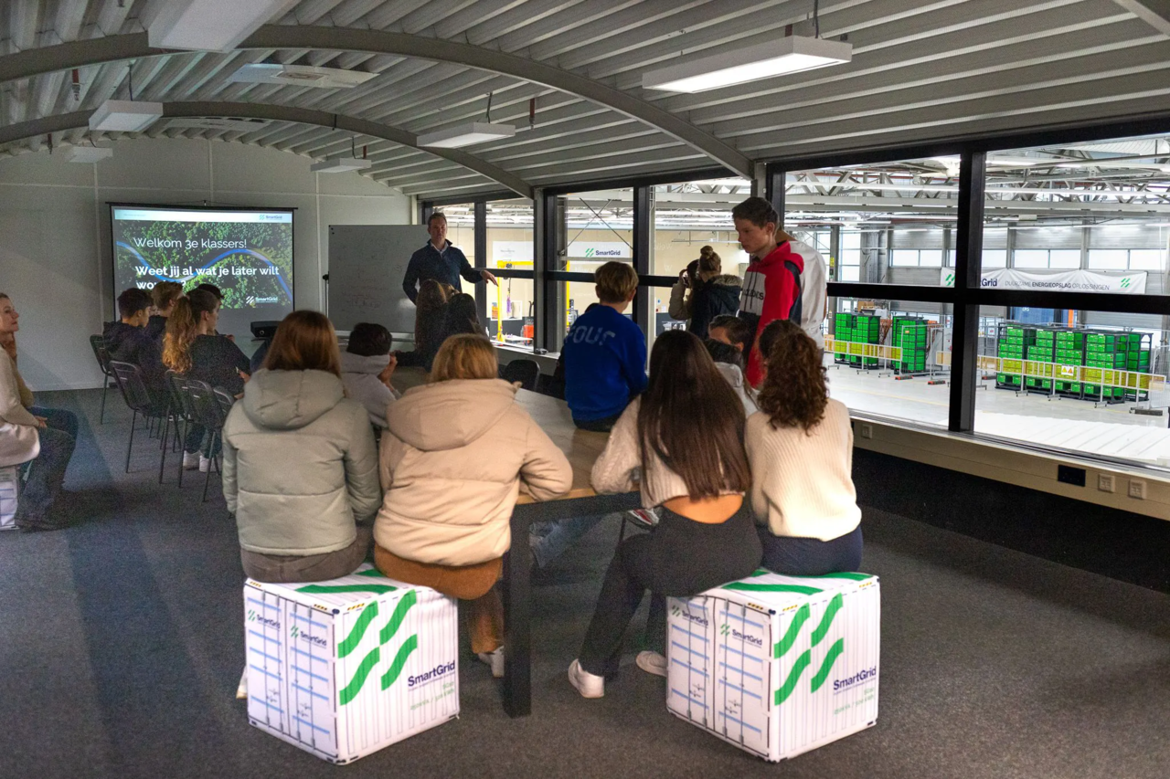 Tijdens de rondleiding over de werkvloer konden onze jeugdige gasten de cleantech in actie zien. Paul Beunk van Super B liet onder andere futuristische Project 2030-batterijen en de nieuwe laserlasmachine zien. Nieuwe Weme engineering, vertegenwoordigd door Thobias Reerink, bood een visueel verhaal over het ontwerp- en ontwikkelingsproces, met behulp van afbeeldingen, tekeningen en video’s. Joost Groothuijs van Vigor Charging maakte indruk met een promotievideo van Vigor en gaf inzicht in V2G-technologie. Tot slot deelde Rob Engelen en Remco de Wit indrukwekkende statistieken en praktijkvoorbeelden, met een kijkje op de werkvloer bij SmartGrid.